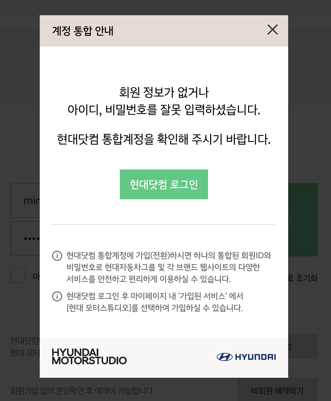 그리고 나서 다시 현대모터스튜디오 사이트로 접속해 현대닷컴과 같은 아이디로 로그인을 하면 로그인이 됩니다.